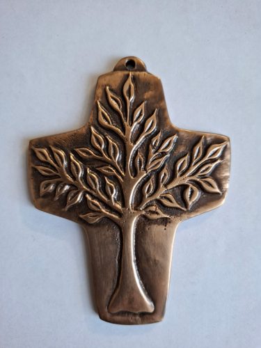 Bronzekreuz, auf das ein belaubter Baum geprägt ist.